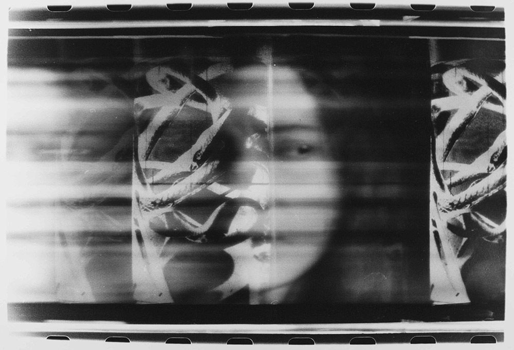 Una tecnica il fotofinish, che ho iniziato a utilizzare e reinventare nei primissimi anni settanta. La linea-fessura tradizionale posta nella finestrella d’entrata della fotocamera viene sostituita da un frammento d’immagine fissa attraverso la quale viene ripreso, sempre con pellicola 35mm, un volto in movimento che si troverà in “combutta” con e decostruito da, l’immagine fissa: le nature, appunto, riprese nel Museo Spallanzani.
