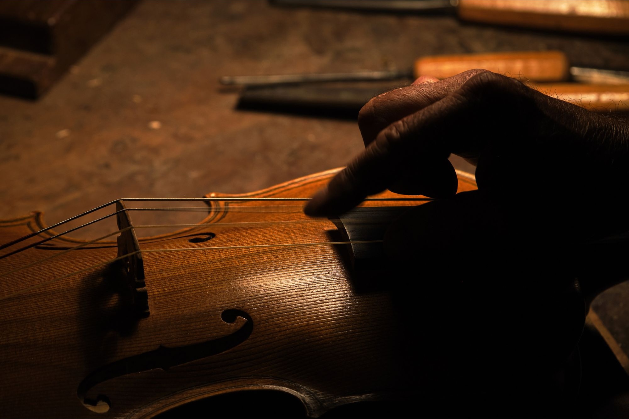 Viaggio nel tempo della musica dal legno al suono: attrezzi immobili, materia grezza, mani che trasformano, geometrie, vibrazione della corda, strumento completo. Ogni momento connesso al precedente, incarnando il passaggio tra ciò che non esiste e ciò che può durare per sempre. Al centro l'essere umano: chi costruisce, suona, ascolta.