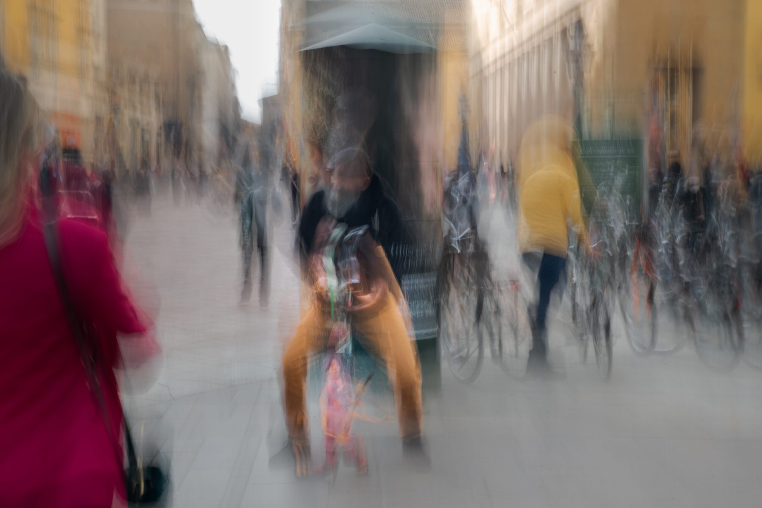 Siamo usciti, difesi da una mascherina, da un periodo difficile, lento ma solidale. Tuttavia oggi, non sappiamo CHI GUARDA CHI. Non sappiamo cosa vede la gente quando ci guarda, se come semplici estranei che si incrociano sulla via, o come anonimi cittadini con un destino simile, tutti di corsa, verso piazze, parchi o spiagge condivisi, solo concentrati ognuno nella propria performance, o come solitari sognatori alla ricerca dei propri fantasmi amati o temuti, ma che mai smetteremo di cercare. Per fortuna però, ancora mossi da una intangibile ma robustissima energia solidale, confidiamo che, pur senza saperlo, accadano cose che ci avvicinano alle paure degli altri, che ci permettano di indossare i loro stessi panni o la loro stessa maschera, e che si torni finalmente ad aprirci a piacevoli complicità e condivisioni.