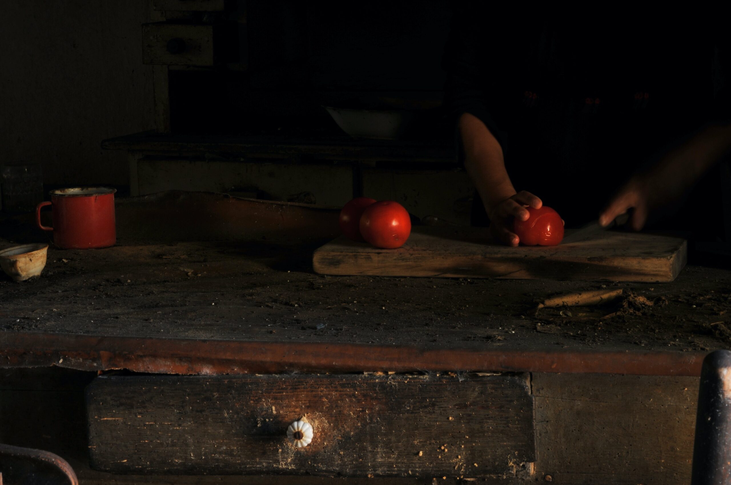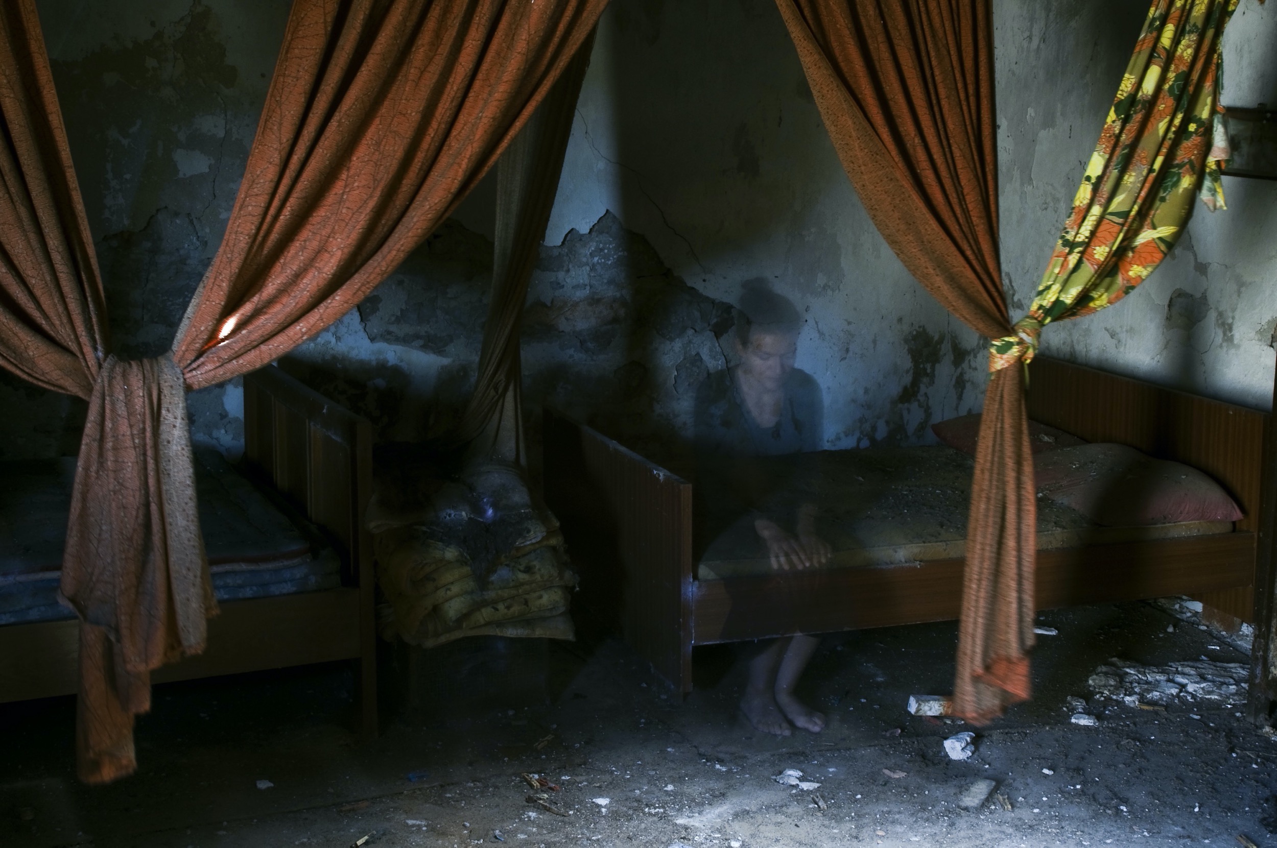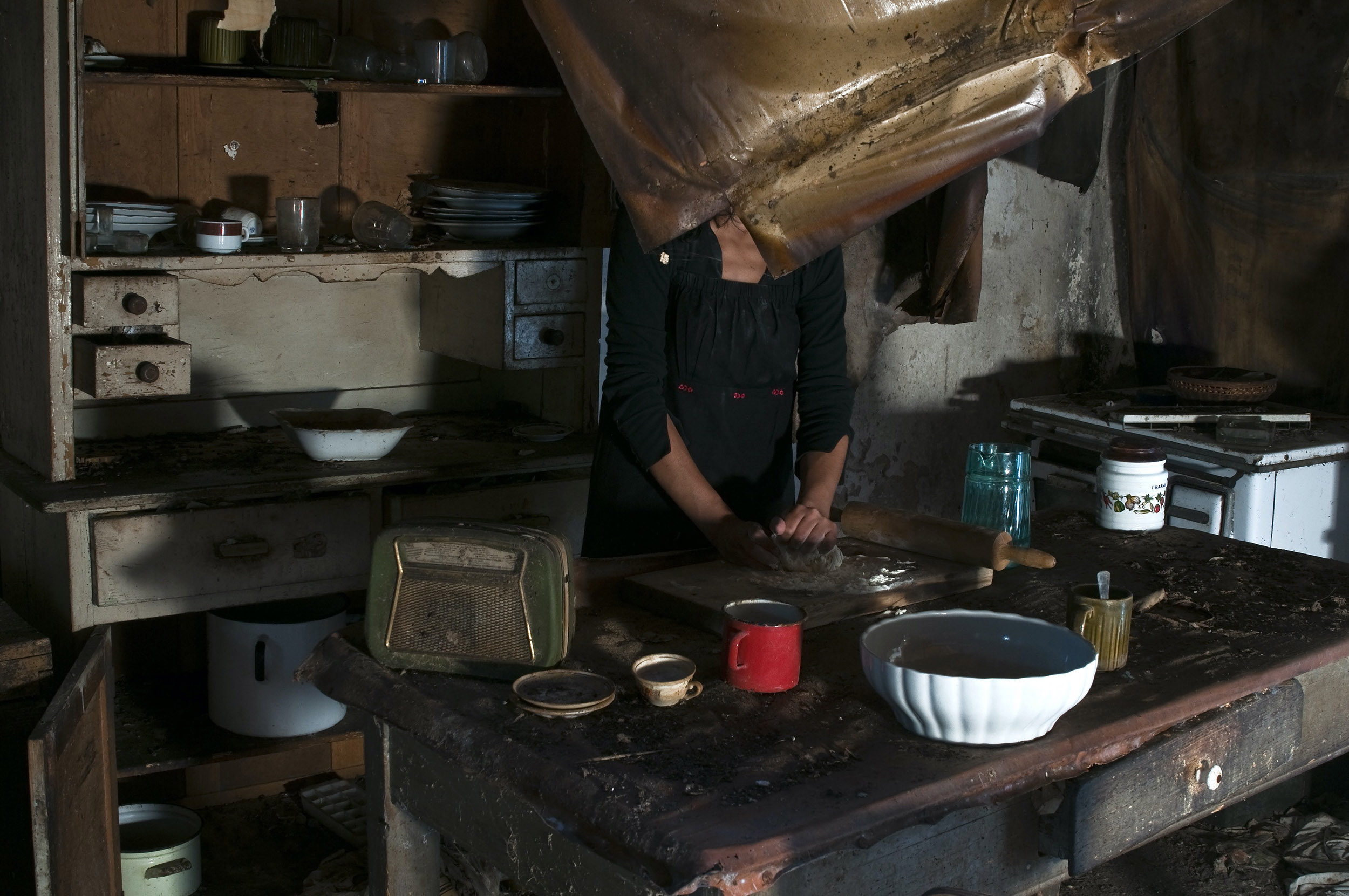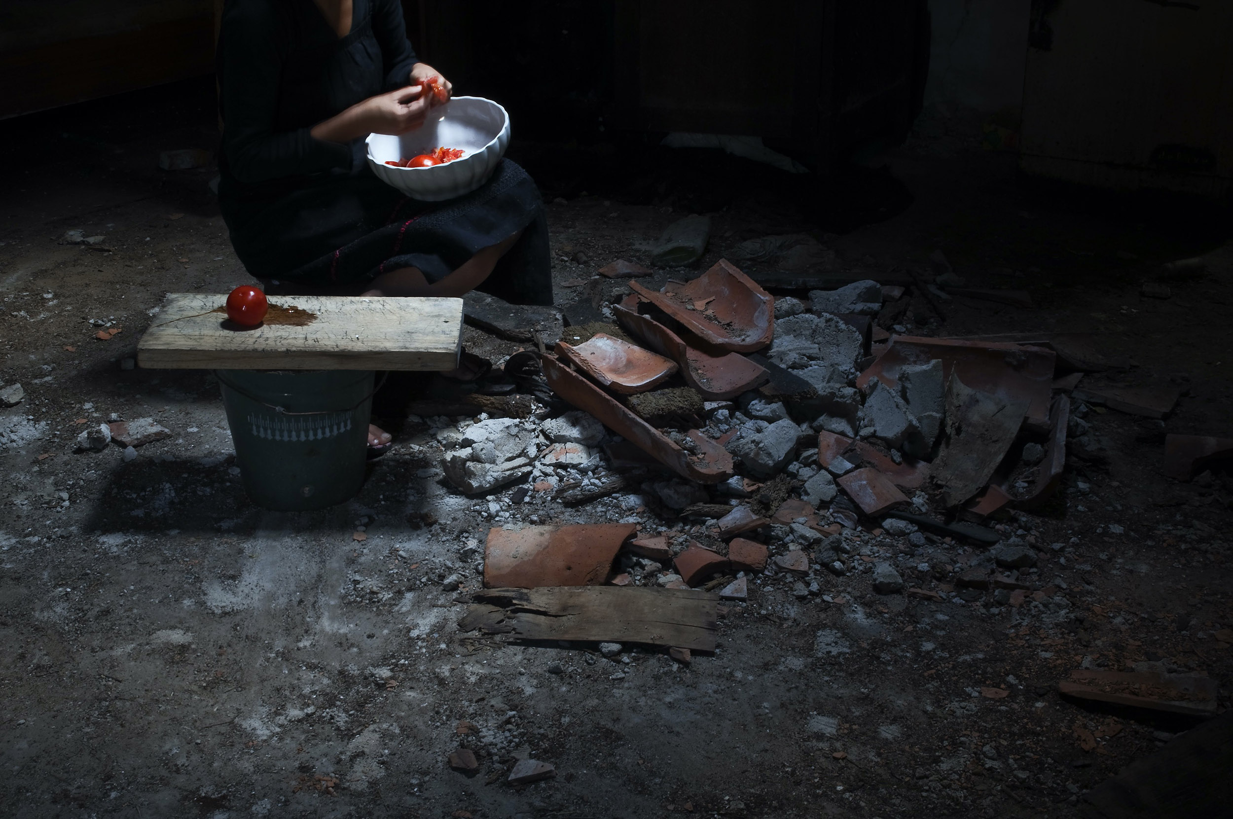 Questa presenza, resa quasi trasparente dalla tecnica fotografica, rievoca rituali domestici mai dimenticati: affettare un pomodoro tra le macerie o abitare stanze ormai invase dalla polvere. Gesti semplici che diventano atti di resistenza della memoria.